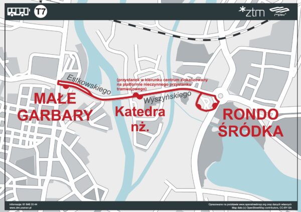 Autobusy linii T7 po wyjeździe z Dworca Śródka skręcą od razu w lewo na wydzielony pas jezdni południowej i będą pomijać przystanek Rondo Śródka na zjeździe z ronda w stronę Katedry, który będzie nieczynny już od pierwszych kursów w poniedziałek 16 lutego. Ponadto na przystanku tramwajowym przy katedrze (po stronie południowej) zostanie wyznaczony tymczasowy przystanek autobusowy Katedra, na którym będą się zatrzymywały autobusy linii T7.