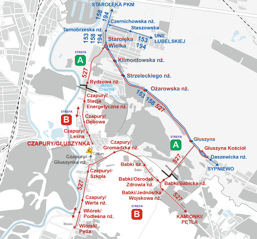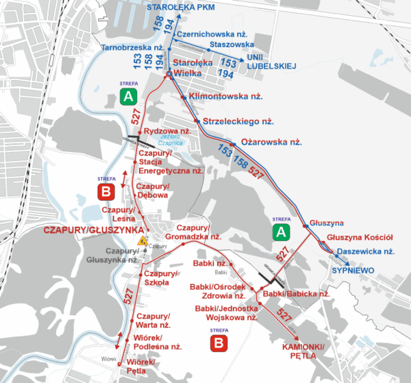 Autobusy linii nr 527 będą kursować w obie strony z wjazdem na przystanki: Babki – Wiórek – Babki. Autobusy będą kończyć i zaczynać bieg na przystanku tymczasowym Czapury Głuszynka, zlokalizowanym przy ul. Poznańskiej w Czapurach (za skrzyżowaniem z ul. Żurawinową, w stronę Poznania).