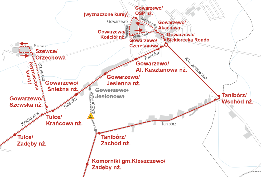 Od 6 do 8 grudnia (sobota-poniedziałek) w związku z budową kanalizacji sanitarnej wyłączony z użytkowania zostanie odcinek ulicy Jesionowej w Gowarzewie. W związku z tym autobusy linii nr 432 w obu kierunkach pojadą objazdem przez Tanibórz.