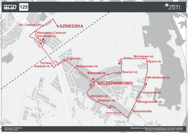 | Linia nr 125 | SZWEDZKA – Szwedzka – Krzywoustego – Ługańska – SZCZEPANKOWO – Skibowa – Glebowa – Gospodarska – Bobrownicka – Michałowo – Sowice – Skibowa – Szczepankowo – Ługańska – Krzywoustego – Klenowska – Szwedzka – SZWEDZKA |