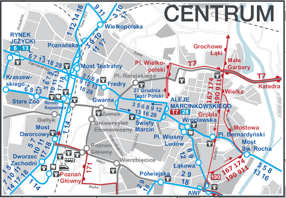 | 13 | JUNIKOWO – Grunwaldzka – Bukowska – Roosevelta – Fredry – Gwarna – Święty Marcin – … – STAROŁĘKA PKM